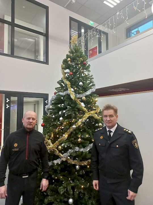Etelä-Pohjanmaan pelastuslaitoksen pelastuspäällikkö Keijo Kangastie (vas.) ja pelastusjohtaja Harri Setälä toivottavat turvallista juhla-aikaa.
