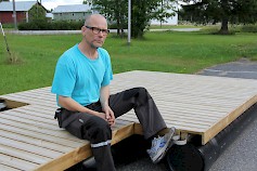 Kuvan Nerkoo 11,5 metrin esittelylaituri on Sunmuovin yritystilojen pihassa. Raimo Rantalan jalka laiturin ankkurointilenkin päällä.
