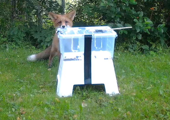 Kettu tutkii rohkeasti ruokasyöttiä tutkimuksessa mukana olleella turkulaisella yksityispihalla. Riistakamerakuva kesän 2025 käyttäytymiskokeista.