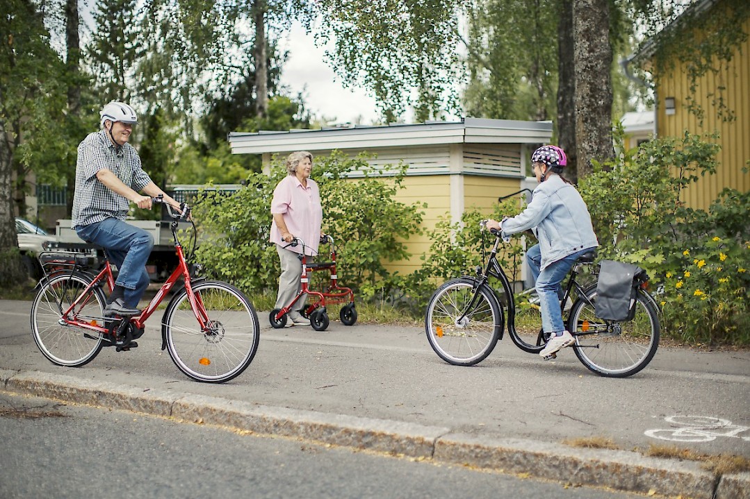 Liikenteessä liikkuu paljon ihmisiä, jotka käyttävät erilaisia liikkumisen apuvälineitä. Fyysinen vamma ei aina näy päällepäin, mutta se voi vaikuttaa esimerkiksi tasapainoon, havainnointiin ja arviointikykyyn. Kuva: Nina Mönkkönen / Liikenneturva